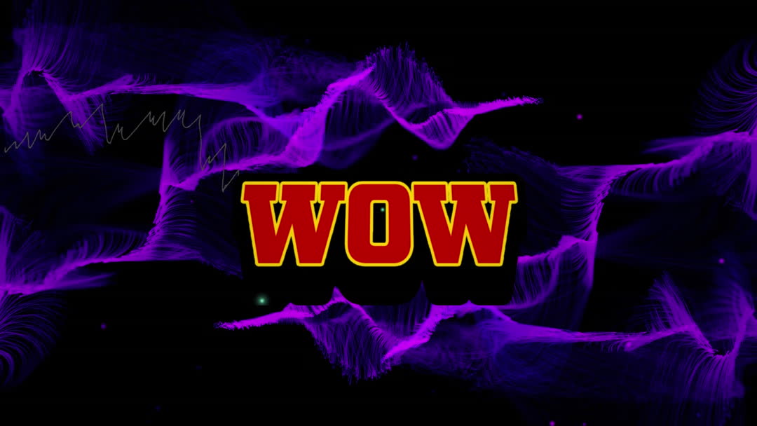 Image showcases vibrant text 'Wow' in bold yellow and red on a dynamic neon purple wave background. Effective for use in digital presentations, creative design projects, marketing materials emphasizing an energetic or exciting theme, or as a graphic element in video games.
