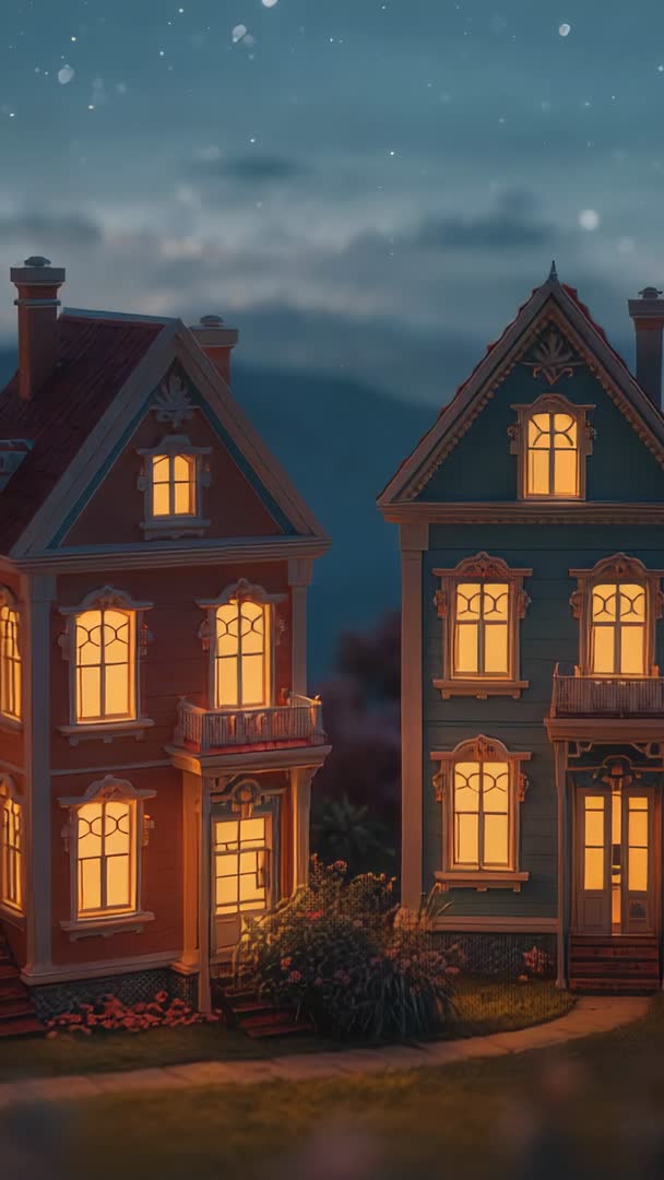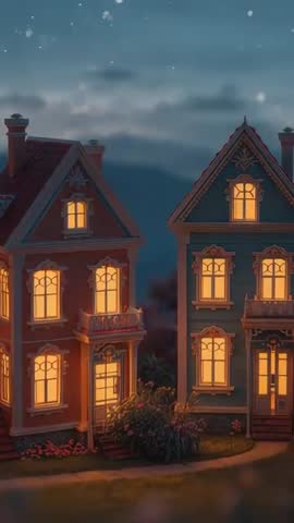 AI Generated Video. Video showing two Victorian houses on quiet street at dusk, warm light glowing from windows while gentle snowfall falling. Ornate trim, decorative balconies, and steep rooflines adding historic charm and visual interest. Use for holiday marketing, seasonal social posts, cinematic title sequences, real estate promotions highlighting period features, blog headers, mobile ads, and video backgrounds for retail or hospitality. Provide loopable feel by extending snowfall and window glow for ambient background usage. Suggest color grading with enhanced warm tones for windows and cool blue shadows for sky to heighten contrast and cozy mood.