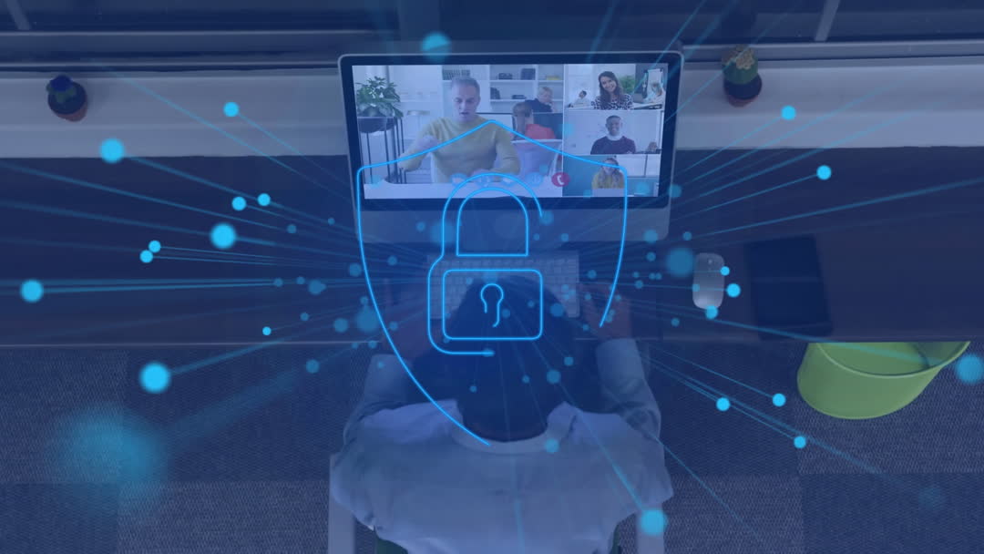 Conceptual video depicting digital security during a virtual business meeting with overlay padlock graphic representing encryption. Useful for illustrating technology in corporate communication, cyber security themes, and global collaboration efforts. Particularly suited for business, technology, or educational website content as a representation of secure communication channels.
