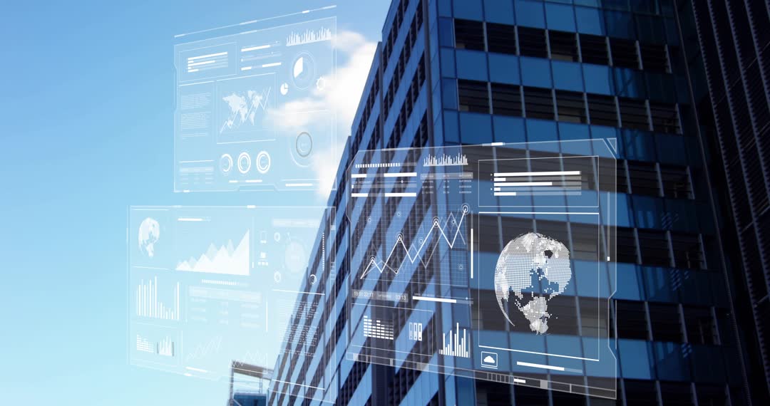 Video clip showing HUD-style data dashboards floating and sliding across blue sky toward reflective glass facade of modern skyscraper. Overlays showing line charts, bar graphs, circular gauges and world map composed of dot matrix. Composition blending urban architecture with futuristic digital UI conveying smart building, business analytics, financial growth and IoT connectivity themes. Visual tone featuring cool blue palette with high contrast reflections on glass. Use cases: Working well for corporate technology presentations, fintech marketing, smart city campaigns, investor pitch videos, website hero banners, explainer videos and annual reports. Editors animating HUD layers for motion graphics, looping clip for background, replacing data panels with branded metrics, grading colors to match brand palette, cropping for vertical social formats and adding sound design for broadcast. Licensing suitable for commercial and editorial projects including marketing, training and product demos.