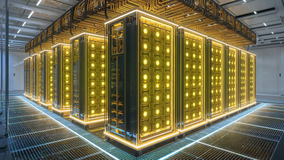 AI Generated Image. Showing rows of illuminated server racks with glowing yellow LED arrays and neatly routed overhead cabling. Camera panning along polished raised-floor aisle, highlighting cooling channels, illuminated cabinet frames, and symmetrical rack layout. Lighting creating warm-gold glow contrasted with cool blue floor lights, producing futuristic high-tech atmosphere. Providing strong visual for illustrating high-performance computing, AI infrastructure, cloud operations, data center design, network security, and hardware scaling. Suitable for corporate presentations, tech marketing videos, website hero backgrounds, product launch reels, training modules, and editorial segments on infrastructure. Suggesting color grading, animated overlays, lower-thirds, and slow reveal cuts for dramatic effect; delivering 16:9 composition ready for 4K timelines.