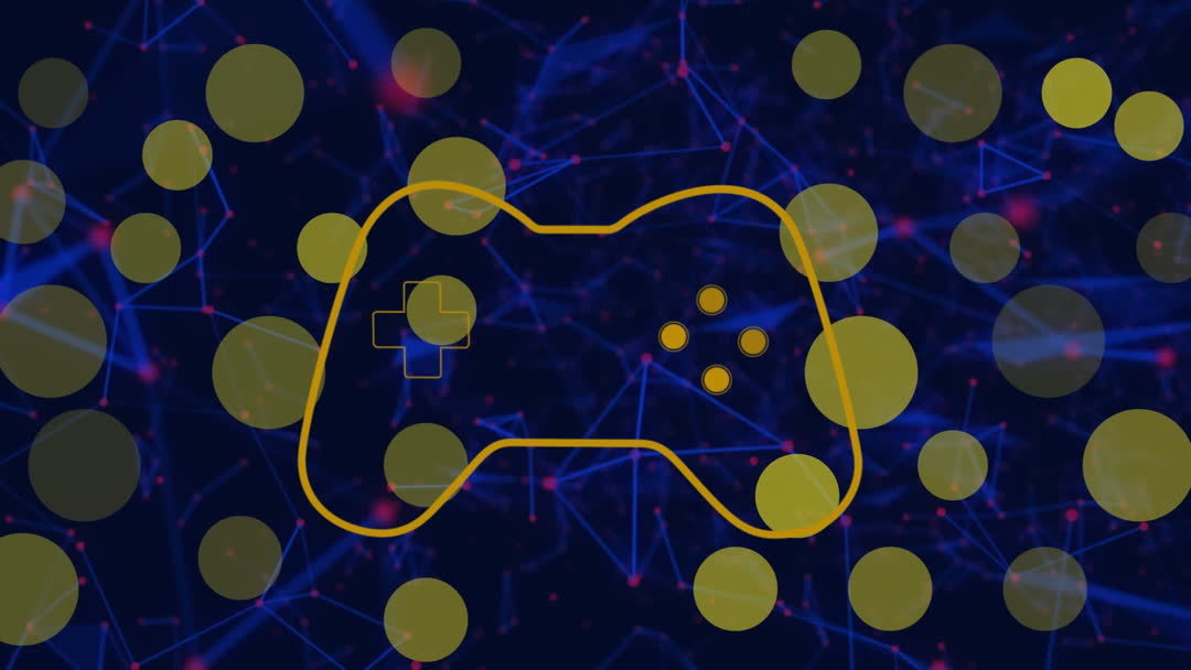 Illustration featuring videogame controller icon surrounded by interconnecting nodes representing plexus networks and yellow orb lights against blue background, conveying modern gaming technology theme. Useful for resources concerning digital innovation, gaming industry insights, e-sports content, or technology promotion.