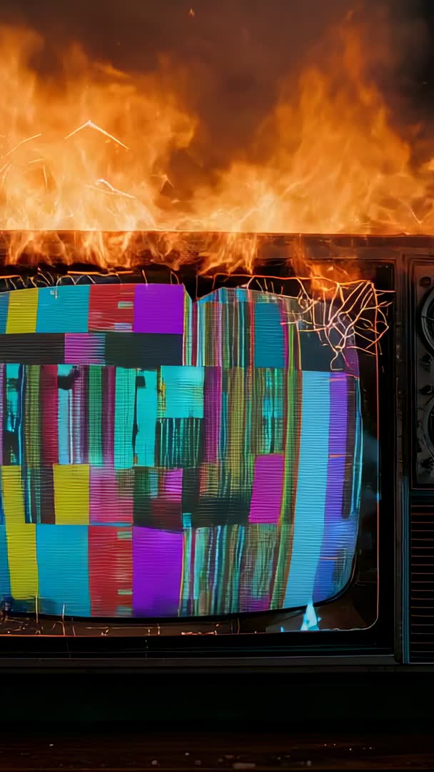 AI Generated Image. Vertical clip showing vintage CRT television sparking, cracking glass, burning and emitting thick smoke while color test pattern distorting into glitchy bands. Capturing intense orange flames licking top of set and bright cyan-magenta bars warping across screen, creating stark cinematic contrast and moody atmosphere. Perfect for dystopian film sequences, music video backdrops, glitch art projects, editorial pieces about media collapse, and social media reels requiring dramatic visual impact. Capturing vertical 9:16 composition, suited for mobile platforms and story formats. Creative tips: loop flames for seamless background, add low-end rumble and crackle sound design, layer glitch overlays and typography for title sequences, and apply color grading to accentuate warm highlights and cool color bar tones. Contains realistic fire and destruction; ensure safe depiction during use and avoid promoting dangerous behavior.