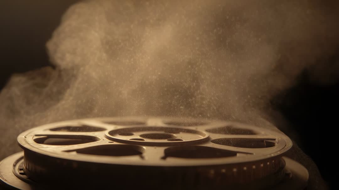 - Vintage film reel rotating with rising dust under warm backlight in dark studio