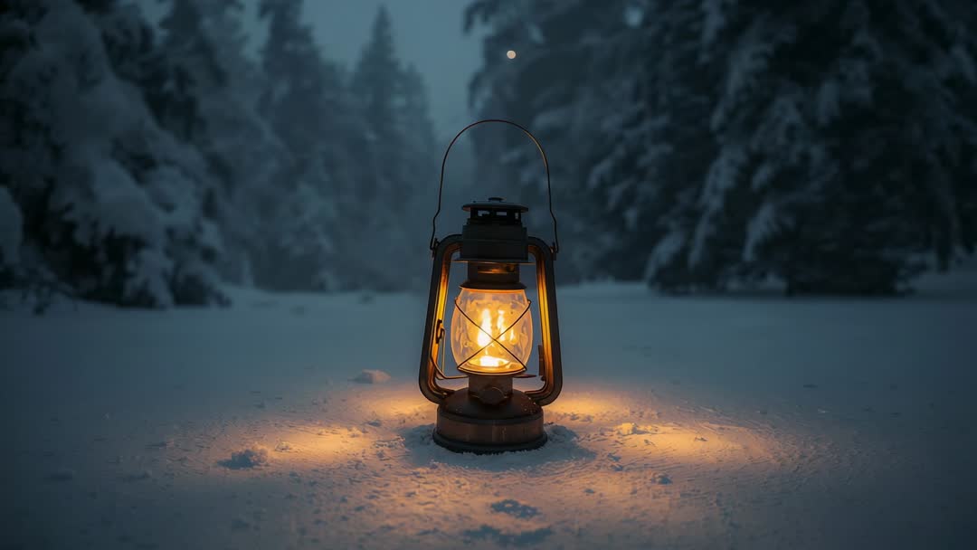 AI Generated Video. Short cinematic video showing vintage metal lantern with flickering flame, casting pulsing amber glow across fresh snow in forest clearing at dusk. Falling snow adding gentle motion and depth, creating atmospheric contrast between warm light and cold surroundings. Useful for holiday greeting cards, seasonal website banners, social media reels, blog headers about solitude or winter travel, book covers for cozy mysteries, advertising for outdoor gear or lantern products, and background loop for film or meditation apps. Offering close-up foreground subject with soft-focus tree line in background, allowing easy text overlay and color grading. Clip working well as short looping footage for mood-setting, transitional scenes, or promotional content that needs cozy warm-to-cold visual contrast.
