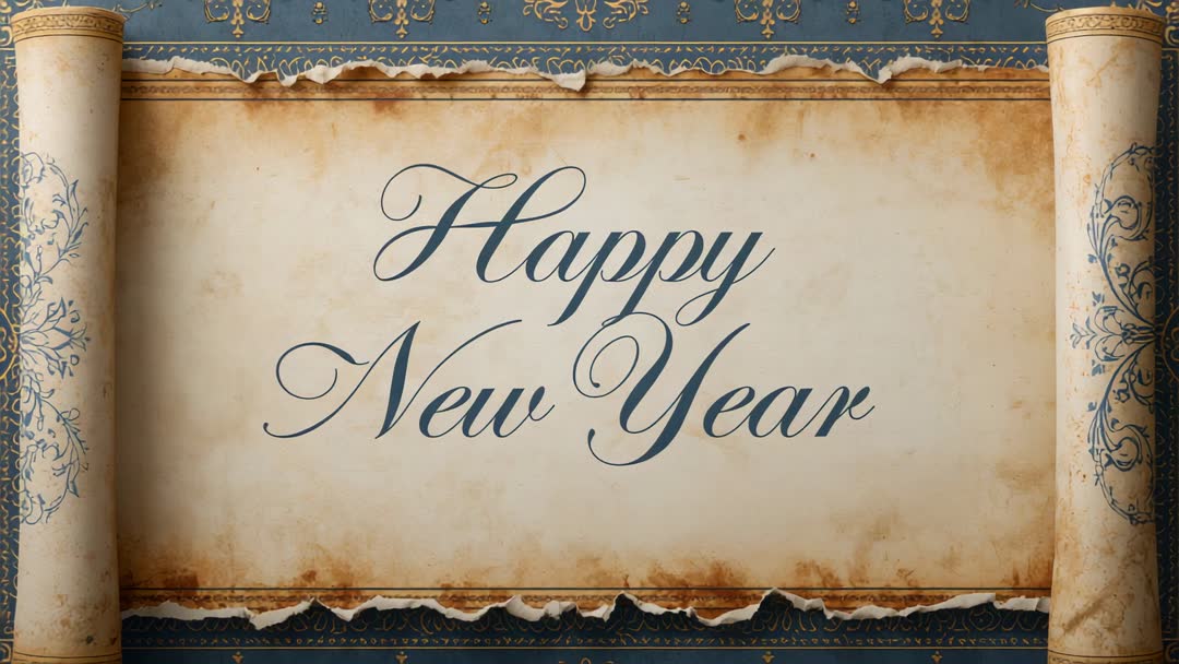 - Vintage parchment scroll unfurling to reveal Happy New Year calligraphy with ornate border