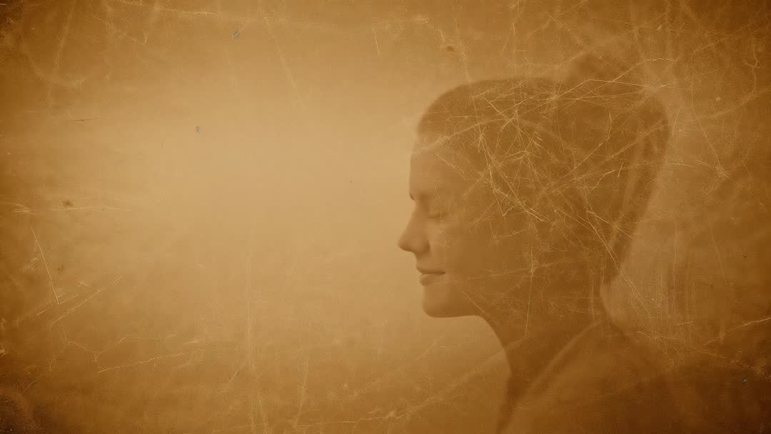 AI Generated Video. Video showing sepia-toned profile of woman making slight head tilts with closed eyes, textured scratches mimicking aged film. Generous left-side negative space allowing overlaying of titles, captions, subtitles. Mood conveying contemplative, serene, introspective tone, suiting historical sequences, memory montages, slow transitions, background loop for websites and social media. Working well in film intros, documentary segments, mental health campaigns, meditation apps, vintage advertising, gallery installations. Delivering loop-ready clip for header banners, podcast covers, YouTube intros, streaming overlays, presentation backgrounds. Color grading and film grain adding authentic retro feel, pairing well with warm typefaces and soft ambient music. Suggested edits including adjusting color warmth, increasing grain level for stronger vintage look, adding subtle film scratches or light leaks for emphasis.