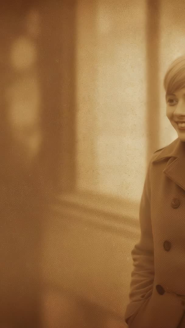 AI Generated Video. Clip showing woman emerging at window, smiling and keeping hands in coat pockets. Sepia tones, soft bokeh, and film grain creating vintage mood and warm atmosphere. Narrow depth and negative space on left providing copy space for titles, captions, or lower-third graphics. Serving as vertical backdrop for social media stories, mobile ads, fashion lookbooks, lifestyle blog headers, nostalgic branded content, or film intros. Editing suggestions: applying subtle slow zoom, adding gentle vignette, overlaying light leaks, and using warm color grade to enhance retro feel. Suitable for seasonal outerwear campaigns, editorial portraits, romantic or nostalgic narratives, and background for testimonial or interview clips.