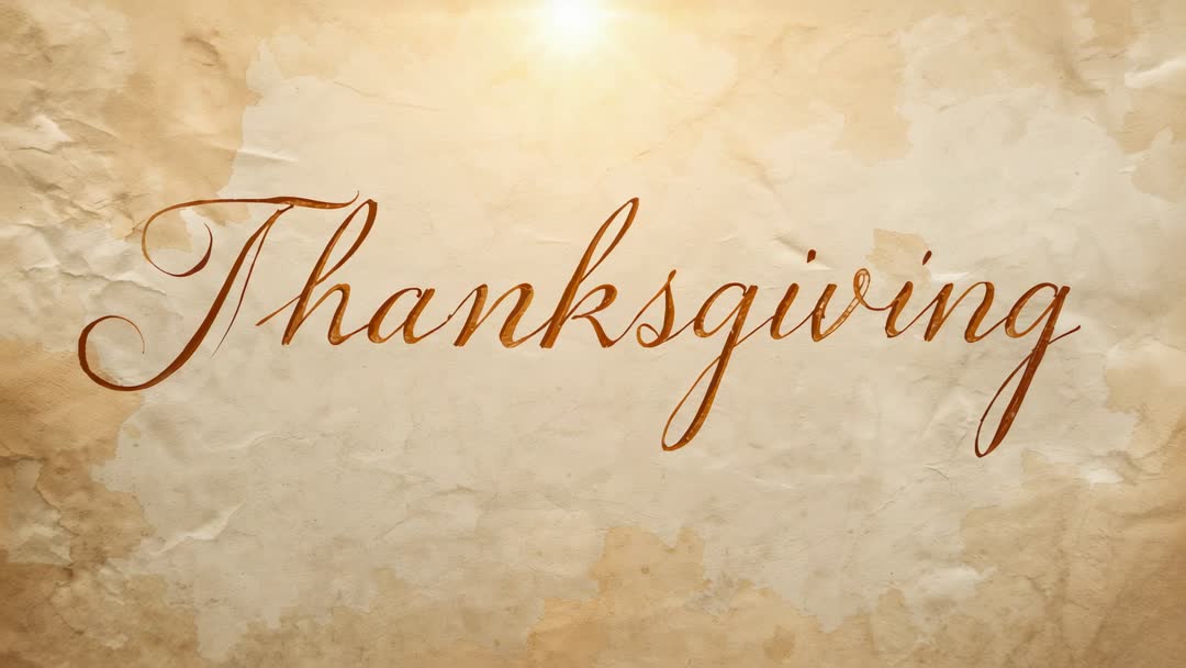 AI Generated Image. Showing elegant Thanksgiving calligraphy sweeping across aged parchment while warm pulsing light casts soft highlights, evoking nostalgic harvest mood. Featuring sepia tones, textured paper creases, subtle vignette and gentle lens flare for cinematic feel. Suiting holiday greeting intros, invitation backgrounds, seasonal marketing spots, social media reels, title slates and menu animations. Offering editable text overlay and color grading compatibility for branding and print. Looping clip suiting opener, background or overlay for Thanksgiving campaigns, church services, restaurant promotions, e-cards and seasonal email headers.