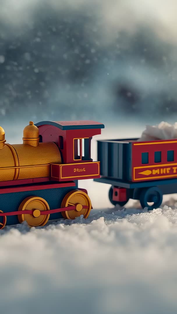 AI Generated Video. Closeup vertical video showing vintage toy locomotive and matching tender rolling across granular snow while plume of smoke drifting into soft bokeh background. Warm gold and red tones evoking nostalgic holiday mood and childhood play. High quality shallow depth of field creating cinematic miniature feel. Ideal for holiday advertisements, social media vertical reels, mobile banners, greeting card animations, toy store promotions, nostalgic editorial features, product packaging mockups. Suggested postproduction techniques include pairing with gentle music box soundtrack, adding subtle snowfall particle overlay, applying slow motion or seamless looping for background use. Composition tips include leaving upper third free for text overlay and using letterbox crop for horizontal needs. Licensing ideas include using for seasonal campaigns, festive blog headers, app splash screens, digital marketing, video postcards, shop window displays.