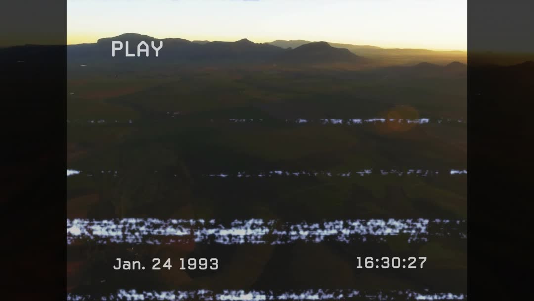 The atmospheric video clip captures a breathtaking view of plateau peaks silhouetted against a serene sunset, augmented with a vintage VHS-style static flicker effect. The timestamp of January 24, 1993, adds a nostalgic feel to the videory. Ideal for use in projects that require a retro or cinematic aesthetic, this can enhance creative narratives in film, presentations, or multimedia art projects. The warm sunset tones and the contrasting cool twilight sky offer a distinct ambiance perfect for stylish and emotive designs.
