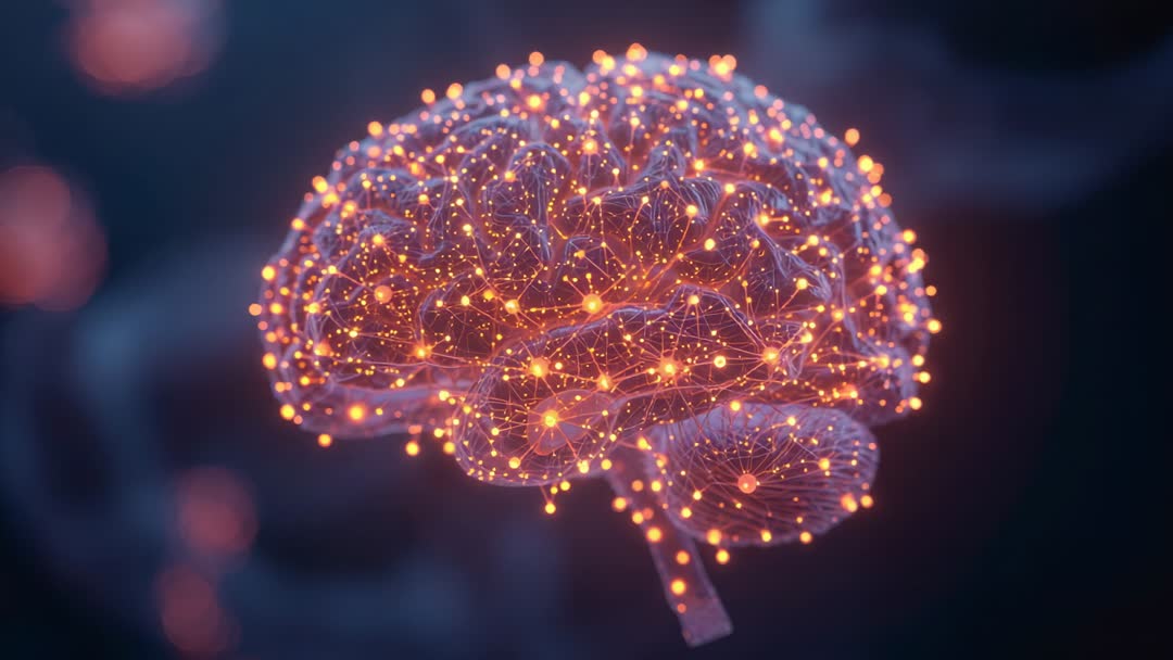 AI Generated Video. The video captures a futuristic 3D digital brain rotating gracefully, highlighting the complexity and innovation associated with neural connections. Pulsing orange nodes emphasize connectivity, reminiscent of data and information flowing through an advanced neural network. This visual can be a compelling addition for projects involving artificial intelligence, cybersecurity, neuroscience studies, neural innovation, and technology workshops. Ideal for presentations, video clips, educational content, and promotional material on digital and technological advancements.
