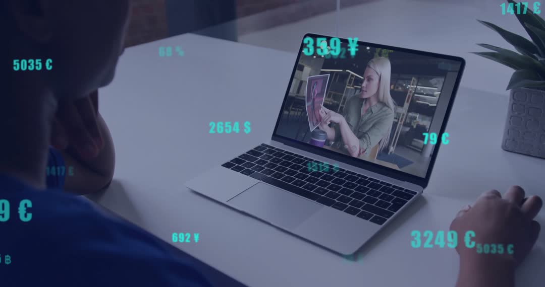 Virtual Communication with Floating Currency Symbols on Laptop Video