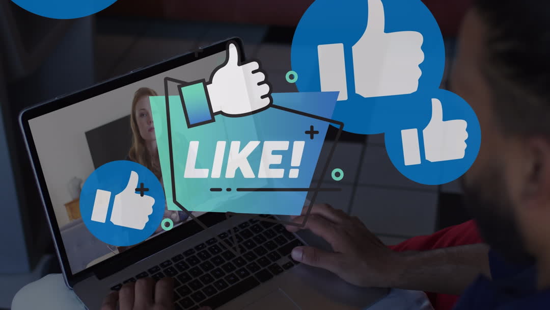 Ideal for themes around digital communication or social media engagement ads. Shows a person using a laptop for a video call with social media 'like' icons floating prominently. Suitable for illustrating concepts of connectivity, virtual meetings, remote communication, and social media influence.