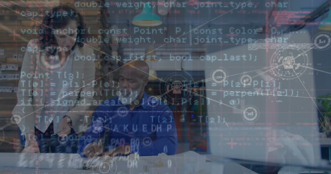 Overlay of computational code combined with coworkers collaborating on a project in an office conveys narrative of modern business integration with technology. Suitable for publications depicting synergy between IT and business functions, as well as for illustrations on the influence of digital information processing in corporate environments.