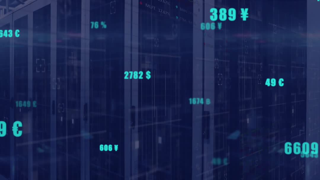 Virtual Exchange Rates Text Overlay in Server Room Video
