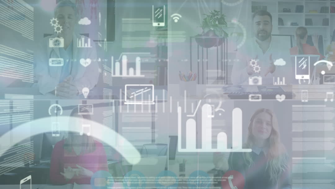 This visual presents a virtual video conference with various digital interface elements superimposed, including data and connection icons, suggesting a futuristic and tech-savvy environment. Ideal for technology and communication presentations, illustrating remote work scenarios, or emphasizing global connectivity trends.