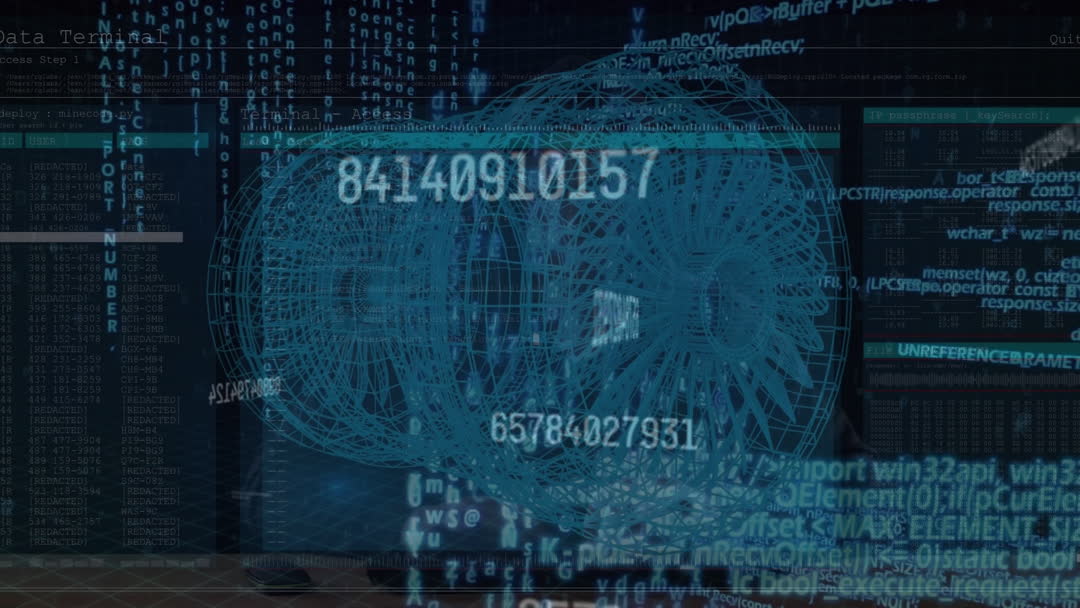 This illustration shows digital data processing and technology networking in a 3D globe format. Ideal for use in presentations related to cybersecurity, information technology, data analysis, and global communications to visually backdrop themes of interconnected digital systems and online secure information transfer.
