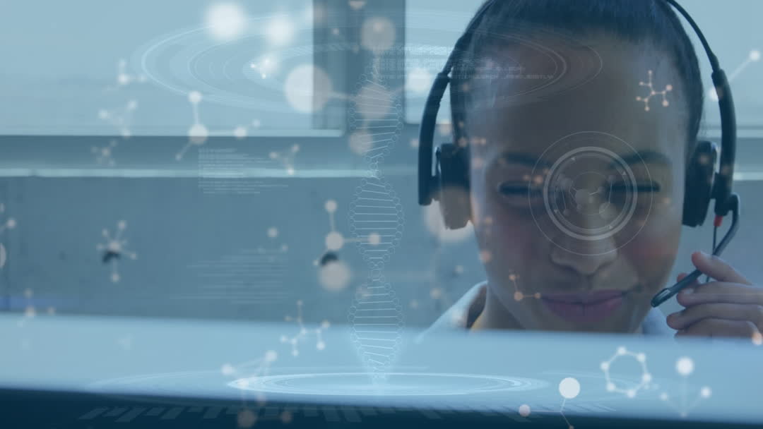 This video depicts an afro-american woman using a phone headset while holographic molecular data is displayed around her. Ideal for illustrating the intersection of advanced technology, medical research, and customer service in healthcare industries. Useful for showcasing innovation in biotech communication practices or futuristic telemedicine solutions.