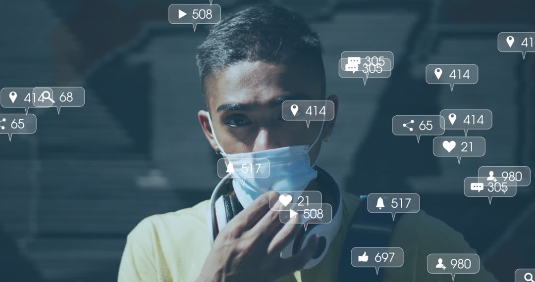 Pandemic representation highlighting virtual interactions through social media notifications overlaying individual with face mask. Symbolizes global connectivity, increased digital interaction, and health compliance amidst COVID-19. Useful for conveying ideas of pandemic communication, technology reliance, and social media influence on society.