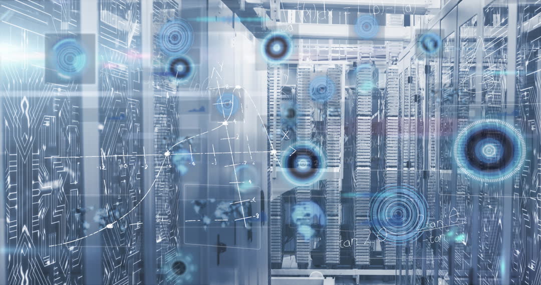 Interconnection of data processing symbols with a server room illustrates modern technological advancements. This visual is ideal for use in digital media addressing topics like high-tech innovations, IT infrastructures, or virtual real-time processing. It's suitable for presentations, articles, and promo materials involving futuristic technologies in business environments.