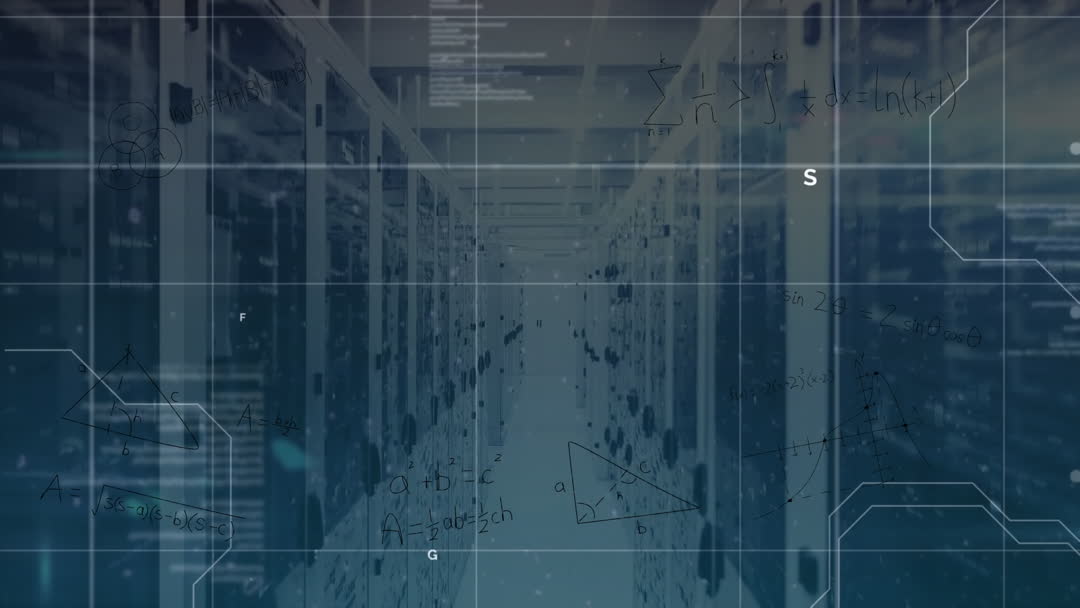 Image features animated mathematical equations overlaying a high-tech server room, suggesting themes of data processing and computational analysis. Ideal for illustrating advanced technology, data calculations, or tech infrastructure topics in promotional materials, educational content, and tech-oriented publications.