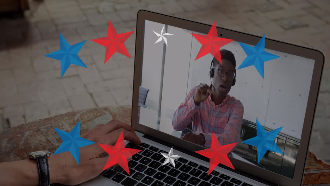 Scene features two people engaged in a video call, one seen on laptop screen discussing. Red, white, and blue stars overlay signifies events, celebrations, or thematic presentation. Useful for topics on virtual meetings, remote work dynamics, international collaboration, or patriotic themes.