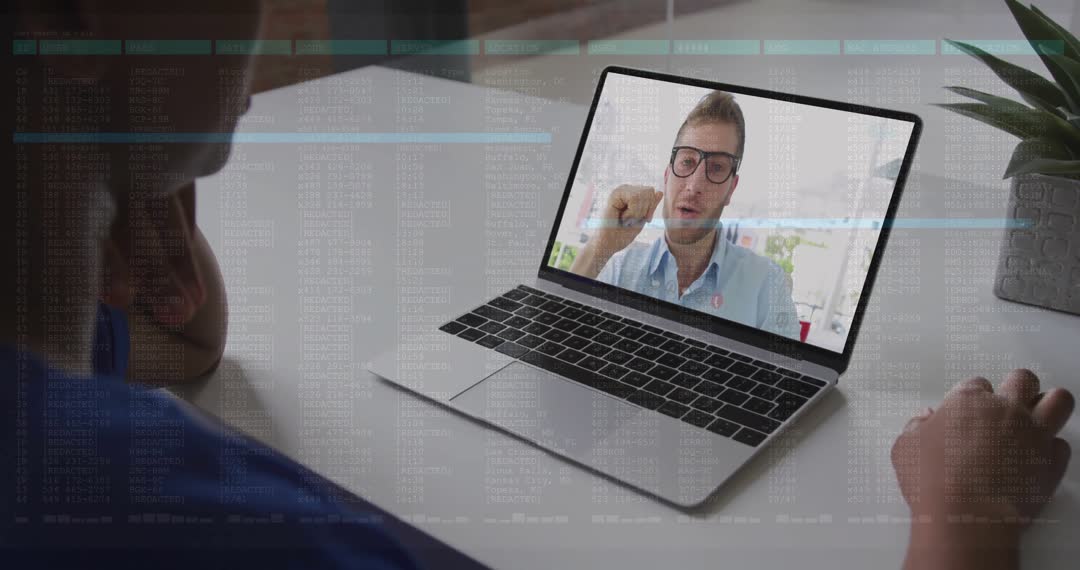 This video captures a person engaged in a virtual cybersecurity meeting on a laptop, overlaid with streaming code data. The setting highlights themes like remote work and digital communication. This visual is ideal for promoting online security seminars, digital collaboration tools, and remote working solutions.
