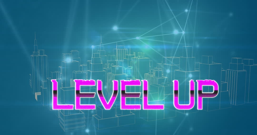 Virtual Metaverse Cityscape with Level Up Overlay Video