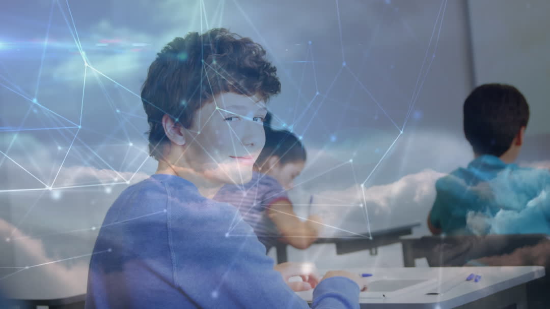 Depicts student in classroom setting, merging educational technology and futuristic network visualization. Useful for illustrating connections between tech and modern learning environments. Suitable for education blogs, tech unveiling, teaching materials.