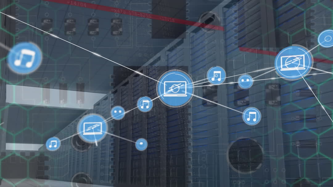 Scene depicts futuristic network icons overlaying a data center setting with rows of server racks. Digital symbols are connected by lines representing the flow of information. This visual suggests technological concepts like cloud computing and digital connectivity, suitable for illustrating ideas related to data management, IT infrastructure, network systems, and modern technology solutions.