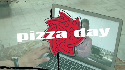 Laptop screen showing joyful virtual celebration for Pizza Day with father and son having a digital interaction. Suitable for promotions about virtual parties, family connections during distancing, and creative lifestyle events involving pizza and technology.