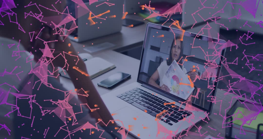 This video showcases a professional giving a virtual presentation viewed on a laptop screen, seamlessly blending with an abstract overlay representing connectivity and technology. It is ideal for illustrating the concept of modern digital communication and can be used in scenarios related to online meetings, remote work, and advancements in networking technology.