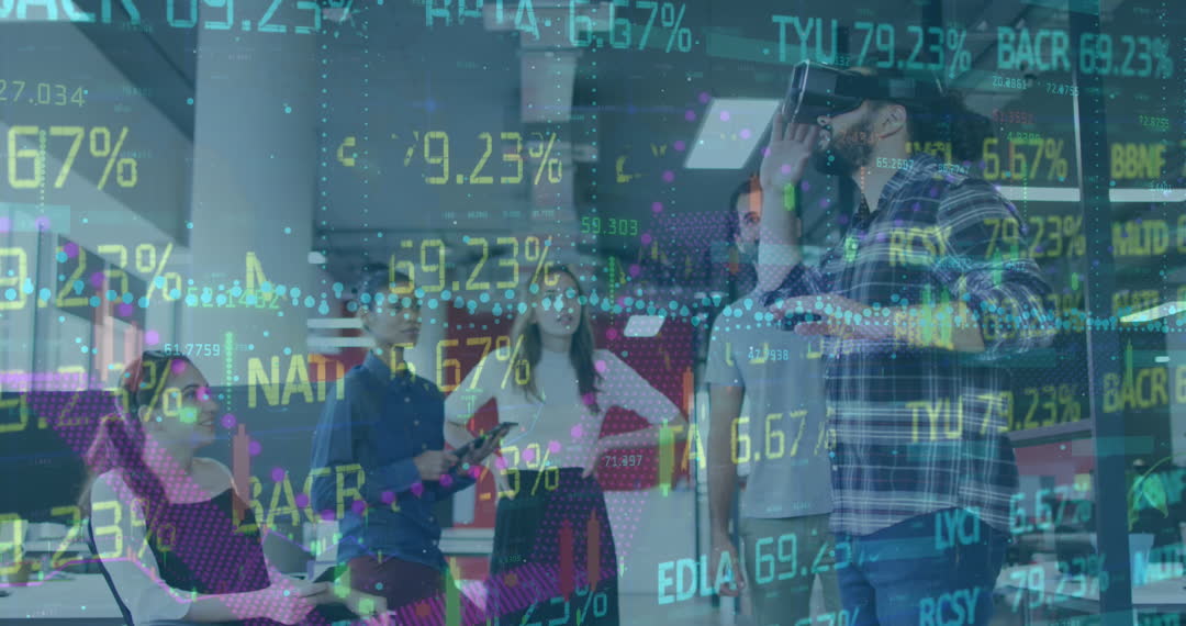 Business professionals in a modern office collaborate using virtual reality technology while financial data is prominently displayed, suggesting innovation in fintech and data analysis. Suitable for use in content about tech advancements, financial services marketing, or corporate strategy seminars.