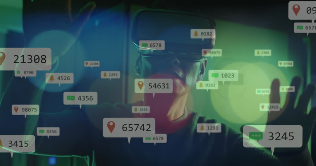 Man wearing VR headset, interacting with data visualizations floating in a high-tech environment. Concept underscores integration of virtual reality and data analysis, showcasing innovation in tech industry and digital transformation. Useful for content promoting high-tech solutions, cloud computing advancements, and futuristic workspaces.