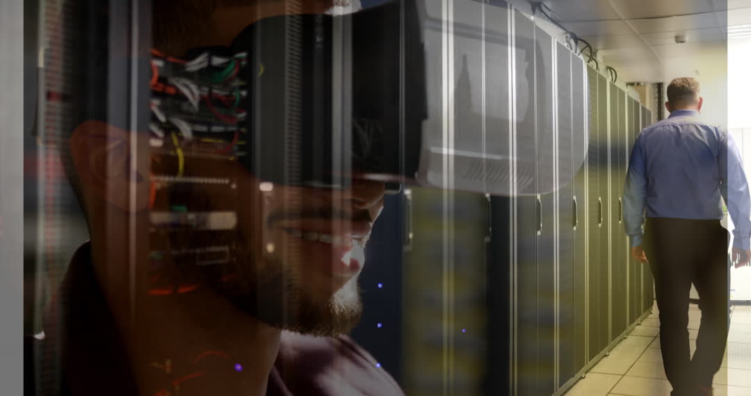 Depiction of a biracial man enjoying a virtual reality experience, superimposed on advanced server environment. Perfect for illustrating themes of innovation in digital technology, immersive media experiences, or cybersecurity contexts. Suitable for tech blogs, digital transformation presentations, or IT industry marketing.