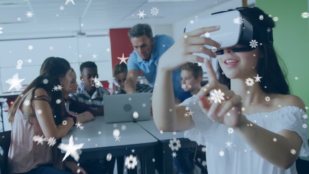 Students in a classroom engaging with a virtual reality learning experience, guided by a teacher. Snowflake visuals create an immersive augmented reality environment. Suitable for educational technology, innovative teaching, diverse learning environments, STEM education magnet.