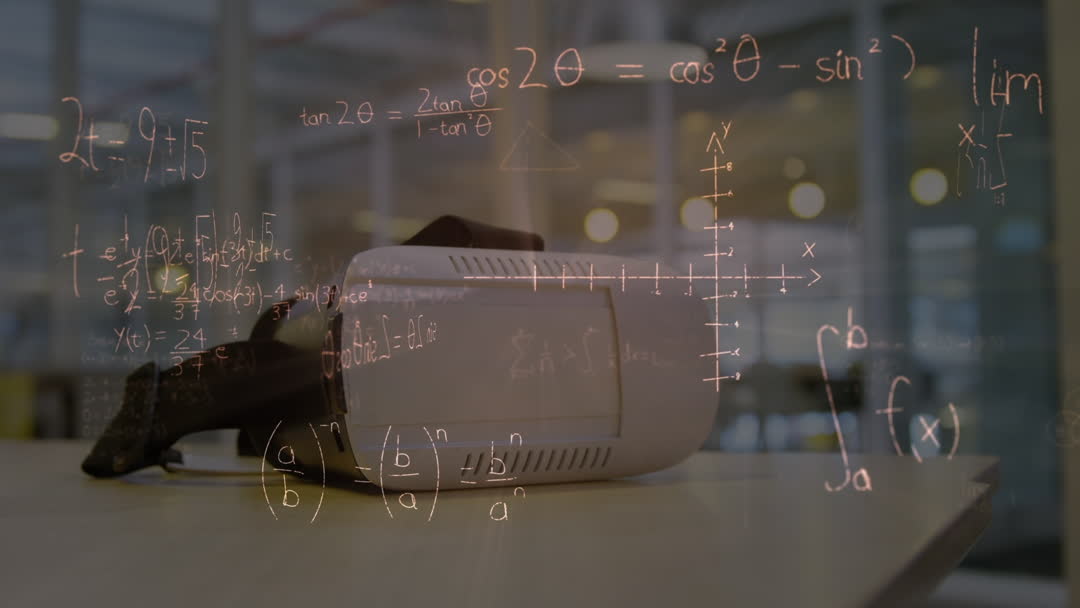 This depiction illustrates a VR headset used as an educational tool, featuring mathematical equations and graphs overlaid. It suggests the integration of virtual reality technology in modern education to enhance learning experiences. Suitable for articles, blog posts, or presentations about advancements in educational technology, mathematics teaching methods, or virtual and augmented reality applications.