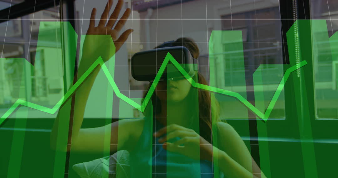Person wearing virtual reality headset interacting with digital data overlay blending futuristic technology with statistical analysis. Useful for illustrating technology integration, innovative business solutions, and modern data exploration in marketing materials, educational content, and presentations.