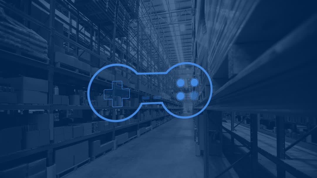Silhouette of a gaming controller overlaid on a warehouse background represents the blending of digital technology with industrial settings, suitable for illustrating themes of innovation, virtual reality, data networking, and modern logistics systems. Ideal for use in technology blogs, industry trends articles, or presentations focusing on the integration of digital solutions in warehousing.