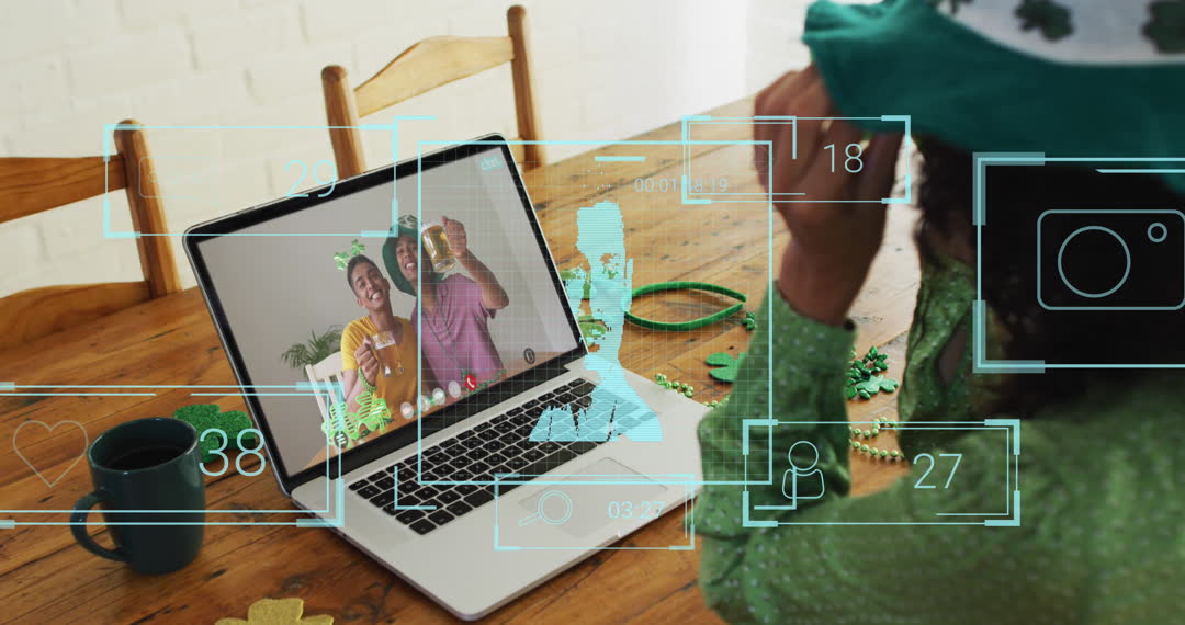 People celebrating St. Patrick's Day virtually using a laptop for a video call with seasonal decorations such as shamrocks visible. The digital icons suggest interaction and engagement in the online realm. Use for themes about remote celebrations, digital connectivity, and holiday festivities.