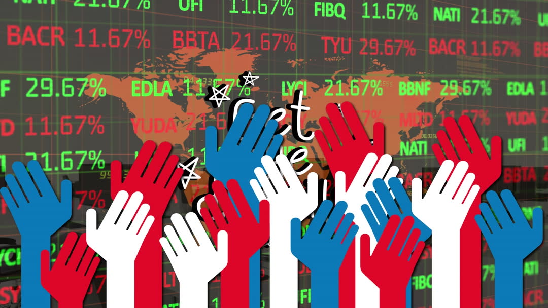 Conceptual illustration depicting virtual stock market involvement with symbolic hand-raising videory alongside a world map adorned with financial figures. Illustrates the impact of global interactions on stock markets. Use for articles on financial readiness, virtual economies, investor participation in global markets.