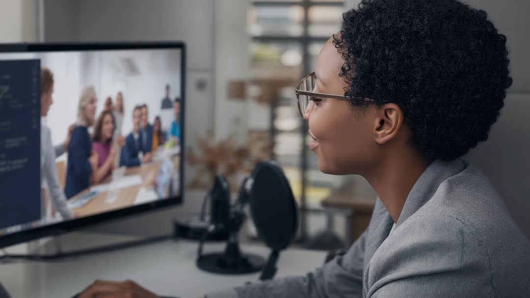 AI Generated Image. Showing professional woman wearing glasses and grey blazer participating in virtual team meeting while typing code on desktop workstation. Camera focusing on side profile with blurred team visible on monitor and microphone and pop filter in foreground. Lighting creating soft natural mood with modern office decor and shallow depth of field delivering clean bokeh. Illustrating remote collaboration, hybrid work culture, developer workflow, online presentations, virtual interviews, podcast or livestream production. Suitable for corporate training videos, tech startup websites, software development tutorials, webinar banners, recruitment campaigns, and blog headers about remote work and digital communication. Horizontal 16:9 composition with ample copy space on left for text, logo, or call-to-action overlays.