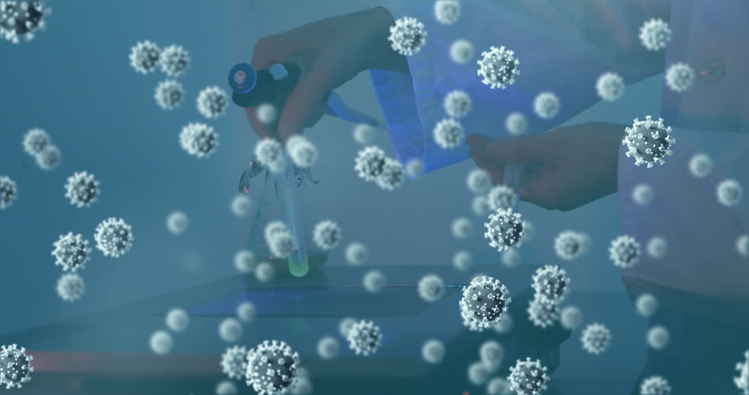This visualization depicts animated virus cells superimposed over a laboratory scene where a caucasian doctor engages in research, offering an impactful atmosphere tied to global health challenges. The blended videory underscores the ongoing studies in virus treatment and prevention, making it ideal for illustrating related articles, educational content on pandemics, or conveying important healthcare messages.