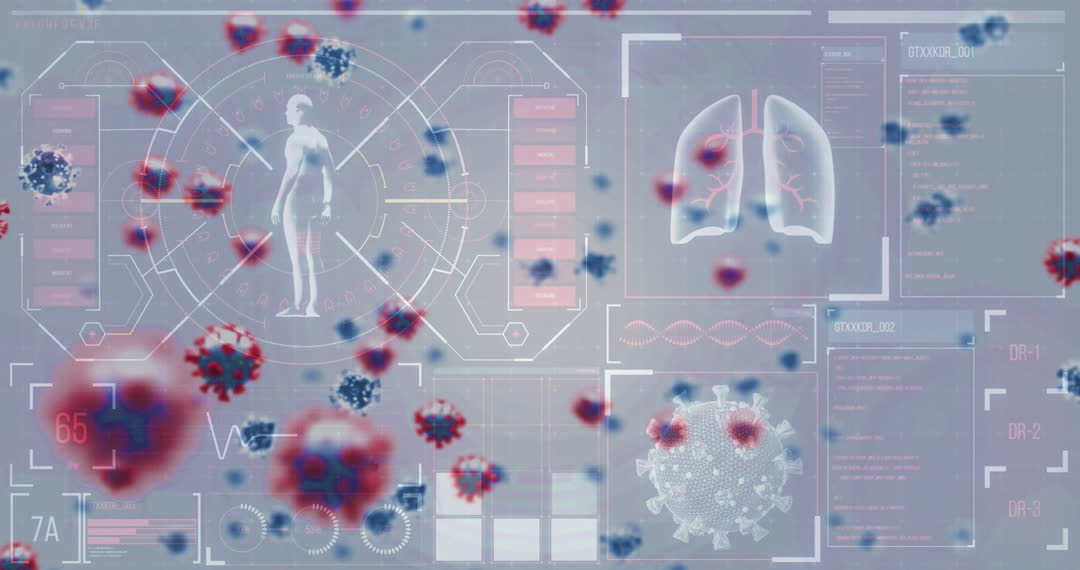 Depicts a conceptual digital interface featuring floating virus cells overlaid on a biological data dashboard. Key highlights include futuristic design with medical data elements like lung analysis and numeric information. Useful for reinforcing themes of modern healthcare technology, scientific research, public health awareness, and medical education tools, particularly relating to COVID-19 and data visualization in healthcare.