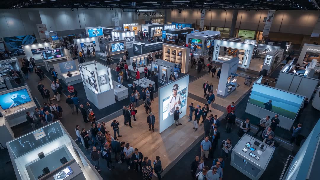 AI Generated Image. Featuring overhead perspective of busy trade show floor, visitors moving between illuminated booths and interacting with touchscreen kiosks and large LED displays. Capturing product demonstrations, live demos, vendor presentations, and informal networking among business professionals. Ideal for use in corporate presentations, event promos, keynote recaps, trade fair marketing, and stock footage libraries. Pairing with voiceover about innovation, technology adoption, exhibition planning, or attendee engagement. Suggesting edits for hero opener, establishing shot, or background B-roll for social media and website landing pages. Providing cinematic lighting and natural crowd movement for editors needing energetic convention scenes.