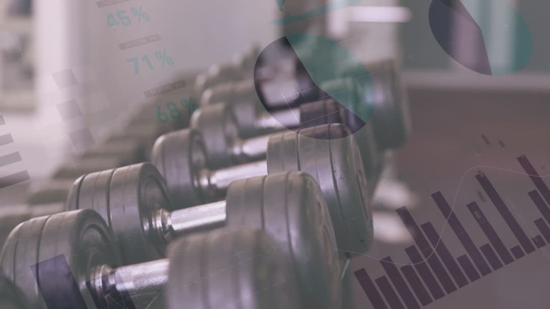 Dumbbells in a gym intertwined with graphs and statistics, highlighting the integration of fitness training with data analytics. Ideal for use in articles or brochures related to smart training, fitness progress tracking apps, or technological advancements in health monitoring.