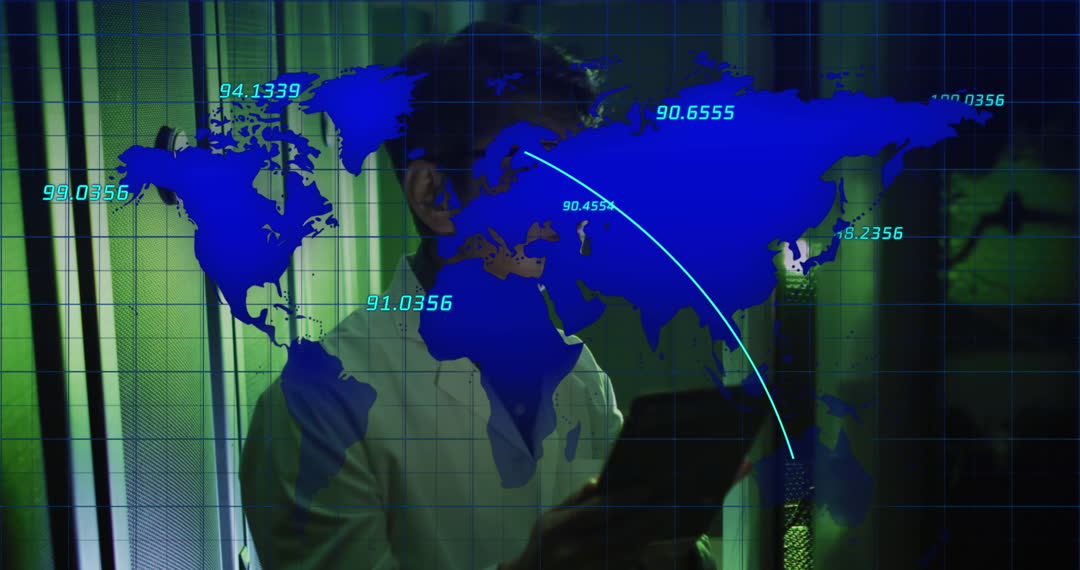 A digital map overlay with data transfer paths displayed on a blue world map, set against a blurred background of a server room. An Asian male worker interacts with invisible interfaces. This visual is ideal for illustrating global data networks, cybersecurity activities, and information technology flows. Use it in presentations about digital business solutions, IT infrastructure, or technological innovations in data science.