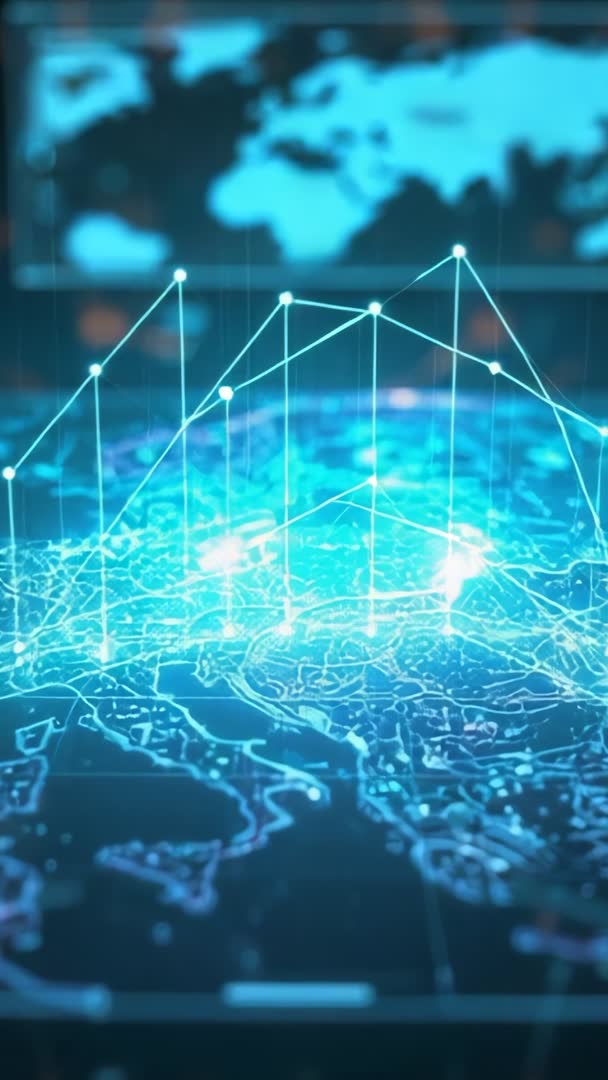 AI Generated Image. Vertical 9:16 video showing holographic global map with glowing blue circuitry and rising connection lines. Pulsing node lights and transparent grid visualizing data flow across continents. Camera dollying forward while nodes emitting light bursts and connecting lines drawing upward to form analytics graph. Serving tech promos, corporate presentations, app intros, social media vertical ads, news motion graphics, broadcast lower thirds, training modules. Color palette focusing on electric blue and cyan for futuristic mood. Loopable elements for background animation and hero screen. Compatible with title overlays and motion graphics; safe for color grading and speed ramping. Editor keywords for postproduction: 3D map, particle effects, glow, depth of field, network graph, telemetry. Licensing suggestion: suitable for commercial tech campaigns, SaaS product launches, financial data reports, telecom brand identity.