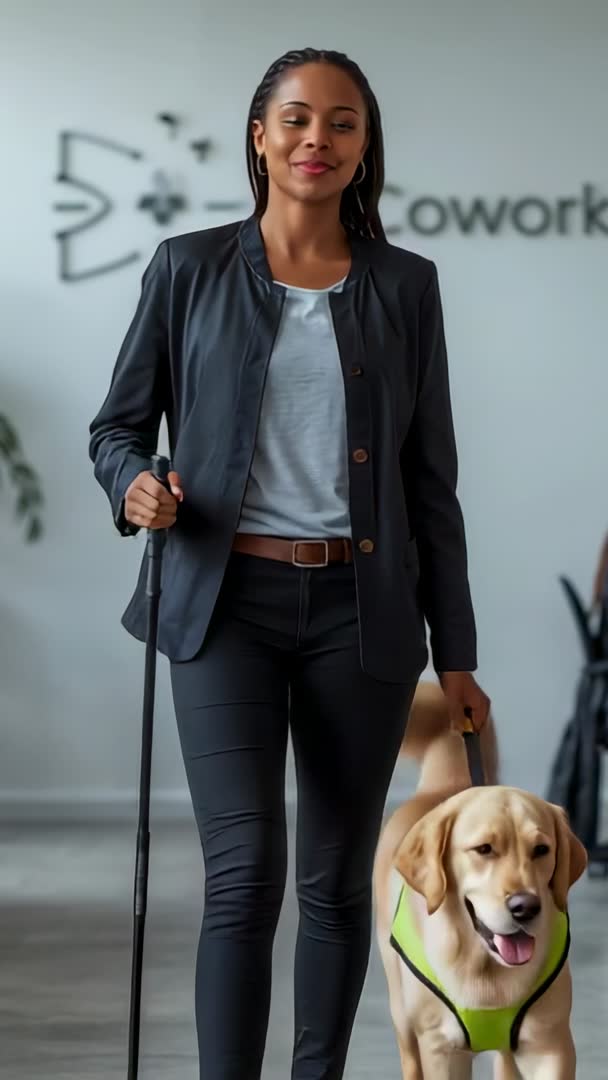 AI Generated Image. Featuring professional woman walking into coworking while navigating with white cane and guide dog. Framing vertical for social media stories, mobile ads, website hero video. Serving diversity and inclusion campaigns, accessibility training, corporate communications, coworking marketing, editorial features on mobility and independence. Showing confident movement, professional attire, friendly service dog wearing bright harness, modern coworking interiors in soft focus. Offering footage for stock libraries, video ads, internal presentations, non profit awareness campaigns, documentary sequences.
